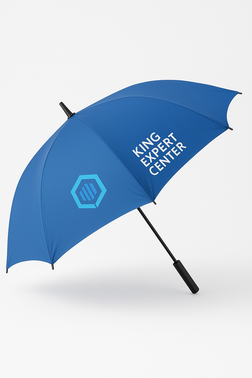 Blijf droog én representatief met deze grote blauwe paraplu voorzien van het King Expert Center-logo. De royale spanwijdte zorgt ervoor dat je optimaal beschermd bent tegen regenbuien, terwijl het sterke frame bestand is tegen wind en intensief gebruik.